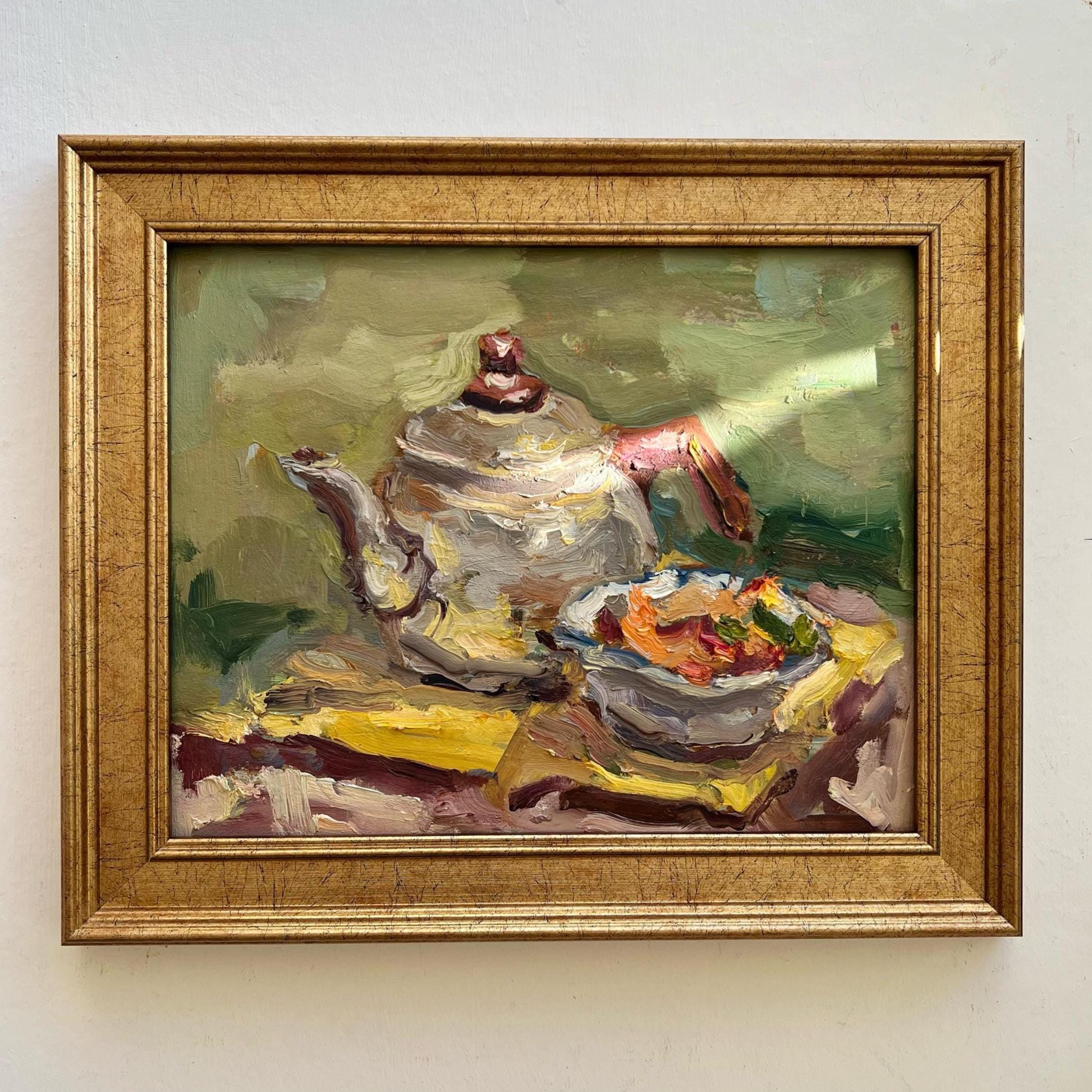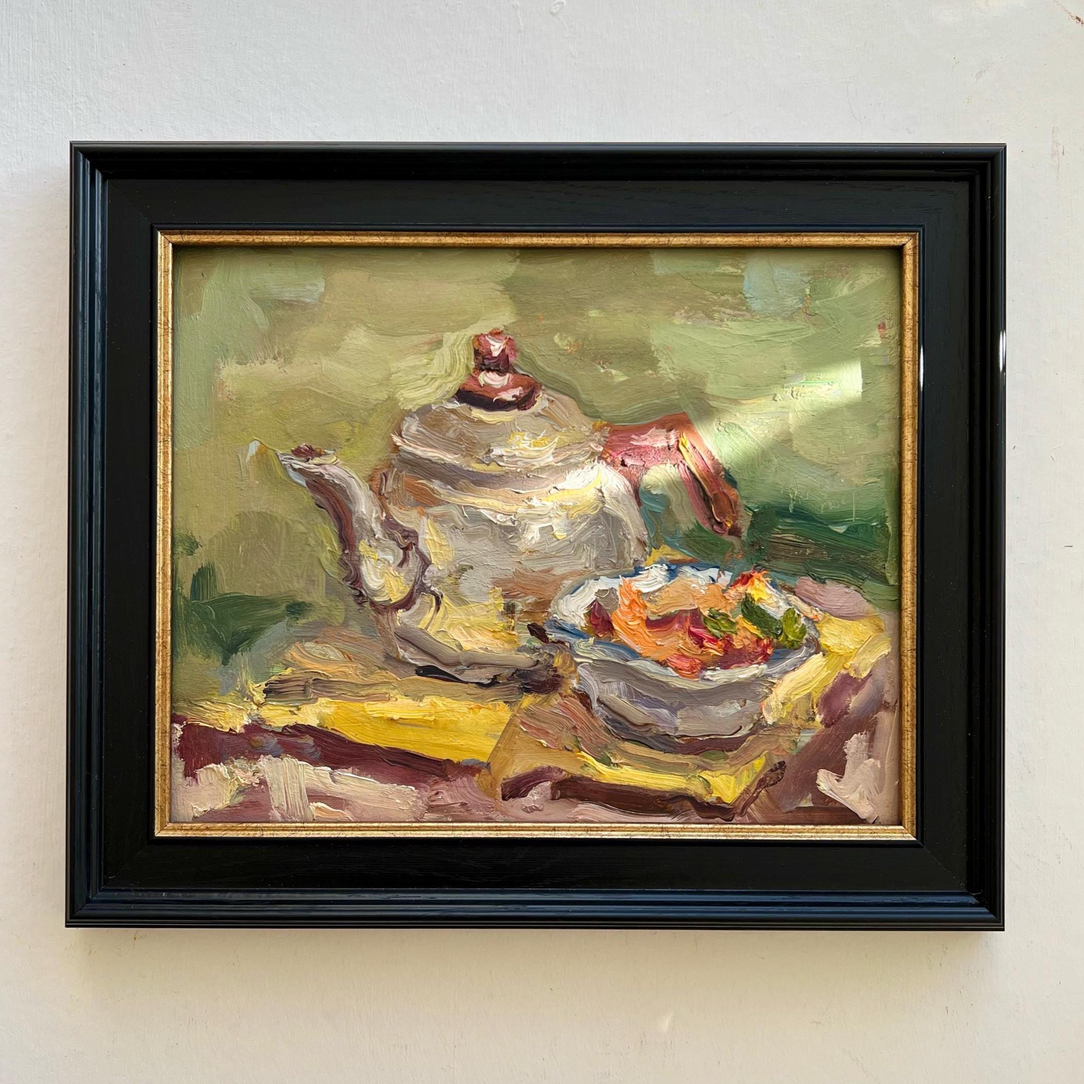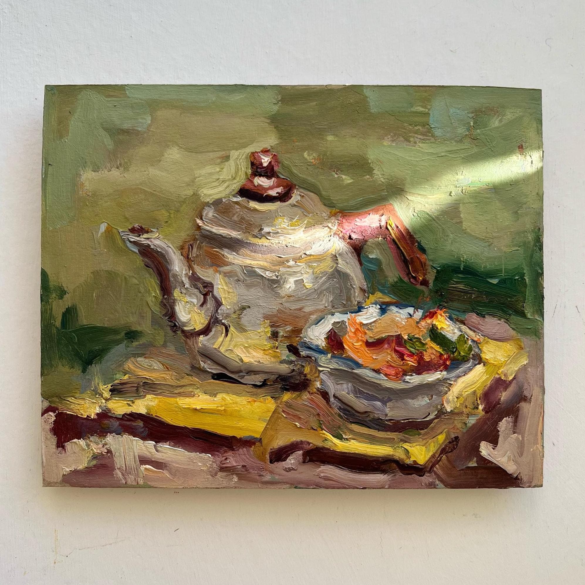 This original oil painting captures a quiet still life moment — a teapot and a bowl arranged on a warm yellow cloth. Painted with expressive, textured brushstrokes, the composition feels intimate and calm, like a pause in the middle of the day.