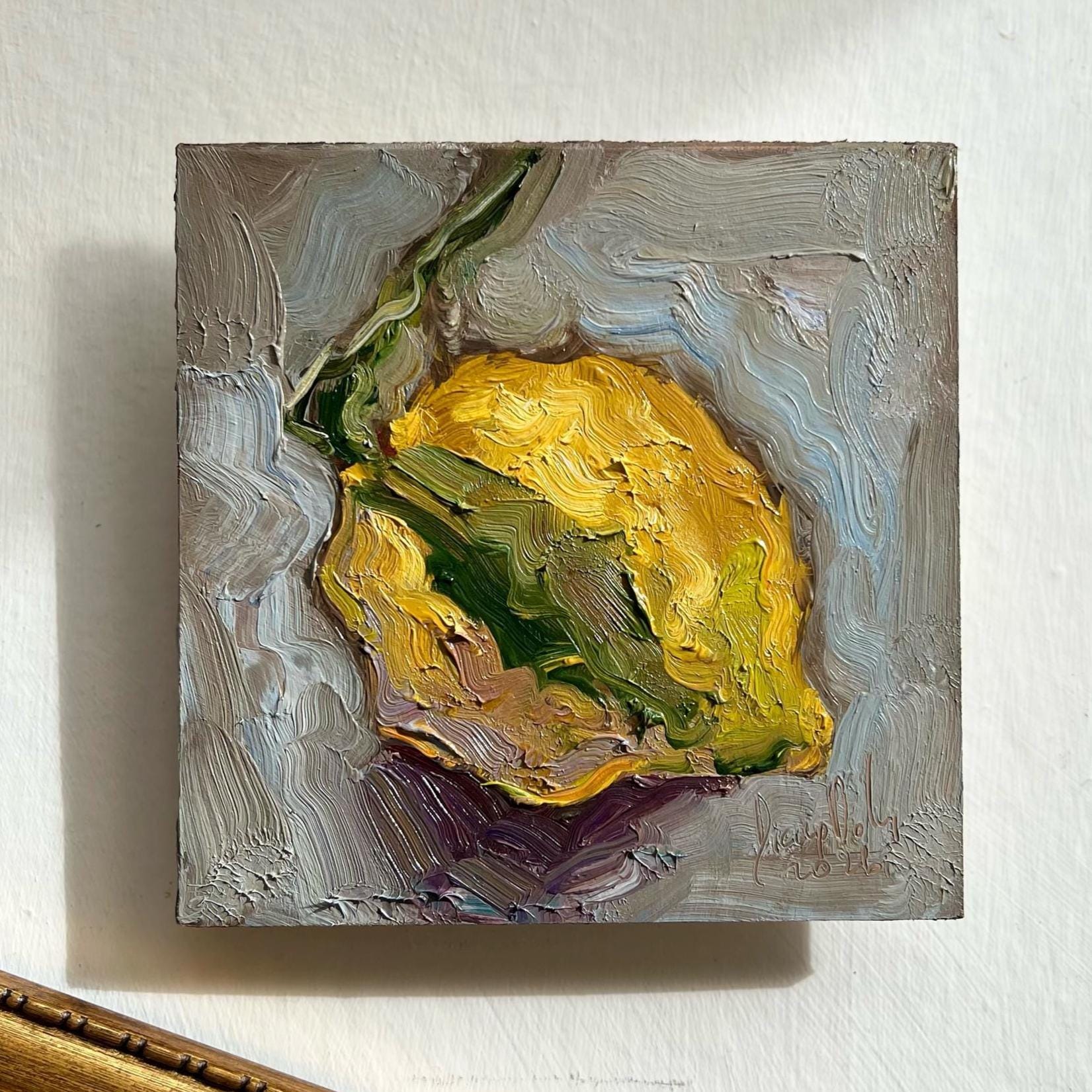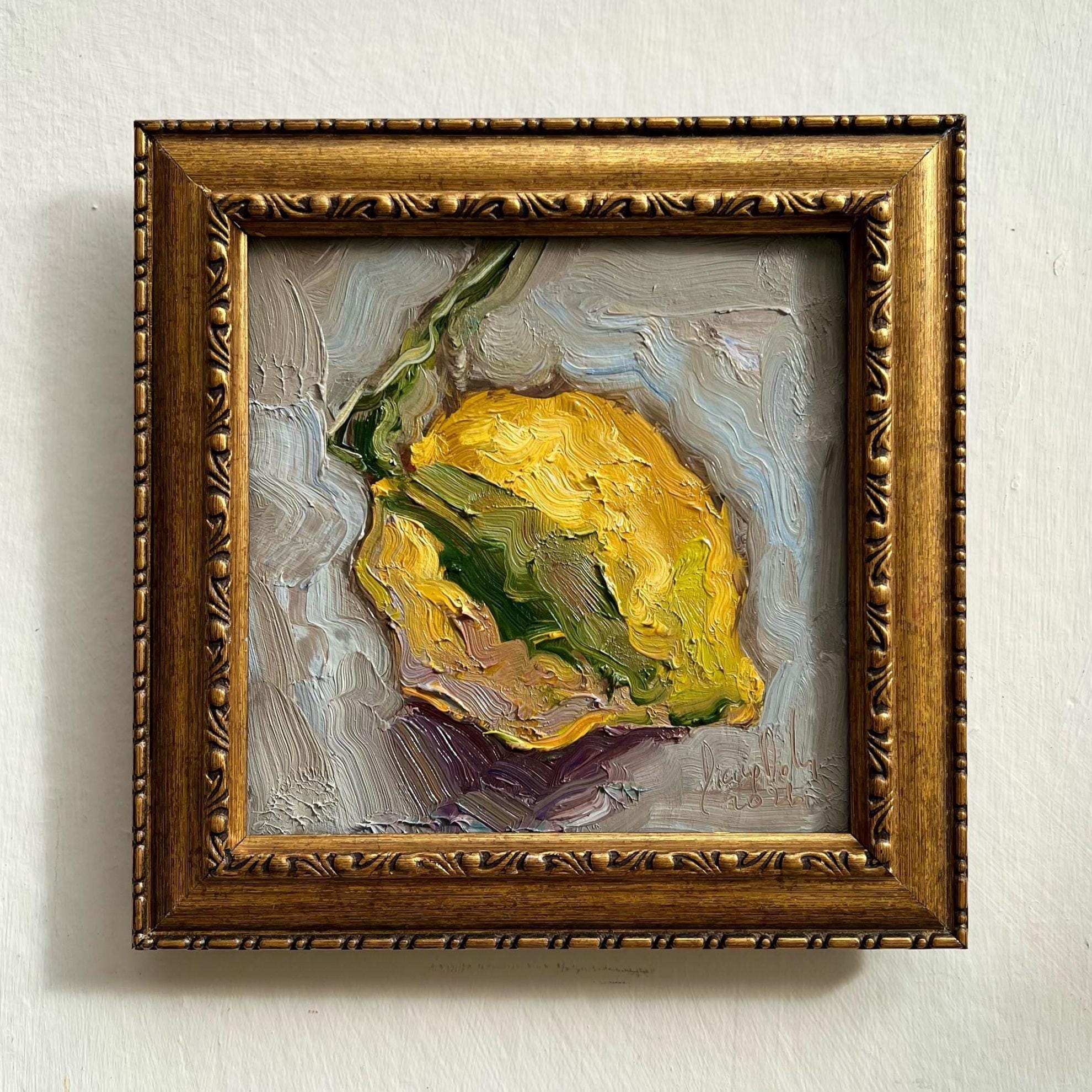 This original oil painting features a simple still life of lemon arranged against a cool, muted background. Thick, expressive brushstrokes and a limited color palette emphasize texture, form, and quiet balance, turning everyday shapes into a calm, contemplative composition.